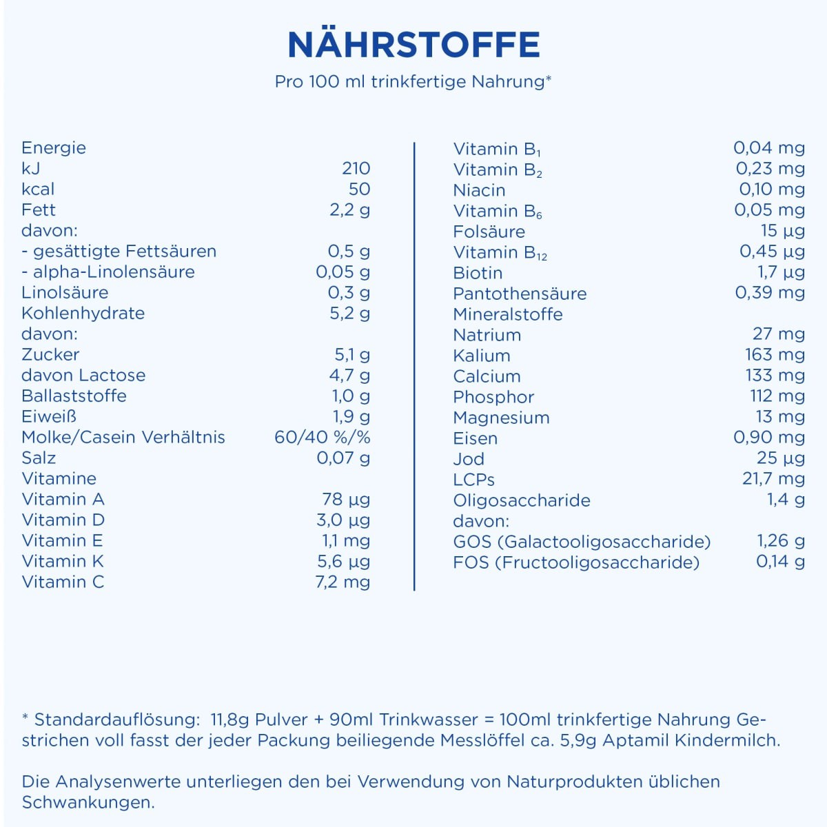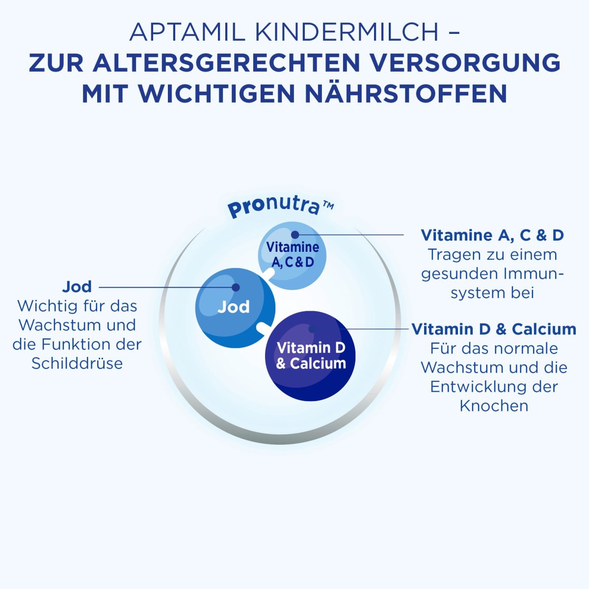 Sữa Aptamil 1+ nội địa Đức bao gồm 13 Vitamin giúp trẻ phát triển toàn diện, hàm lượng canxi cao chống còi xương và phát triển chiều cao, hàm lượng magnesium thích hợp ổn định hệ thống tiêu hóa tránh cho trẻ bị khó tiêu, táo bón.