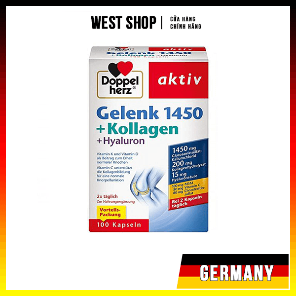 Thuốc bổ xương khớp DoppelHerz Gelenk 1450 là sự kết hợp của Collagen & Hyaluron. Sản phẩm có các thành phần: 1450 mg glucosamin, vitamin C, D, 200mg Kollagen và 15mg Hyaluron. Sản phẩm thích hợp cho người có biểu hiện thoái hoá xương khớp, giúp làm chậm tiến trình của lão hoá khớp, làm giảm đau xương khớp và tăng cường sụn khớp và duy trì ổn định cấu trúc cơ thể.